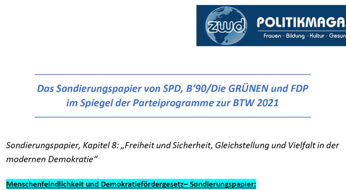 Wieweit geht die Übereinstimmung und wie groß sind die Differenzen zwischen SPD und GRÜNEN einerseits sowie zur FDP andererseits? Das zwd-POLITIKMAGAZIN hat dazu eine vergleichende Übersicht erstellt. Sie steht unseren Abonnent:innen vorab zur Verfügung. mehr...