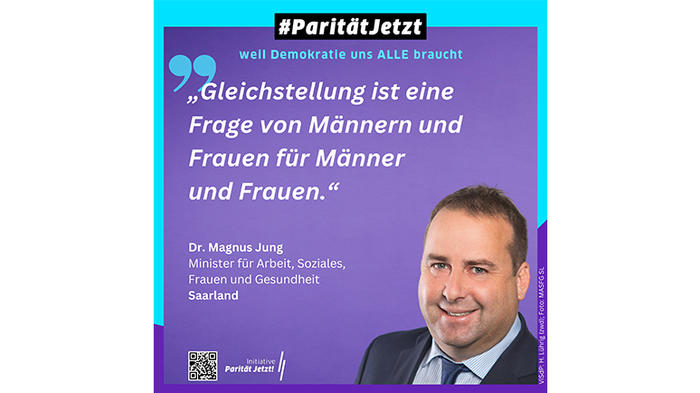 Der saarländische Minister für Minister für Arbeit, Soziales, Frauen und Gesundheit Dr. Magnus Jung (SPD) hat die Kampagne "ParitätJetzt!" mit einem Testimonial-Statement unterstützt: "Gleichstellung ist eine Frage von Männern und Frauen für Männer und Frauen." mehr...